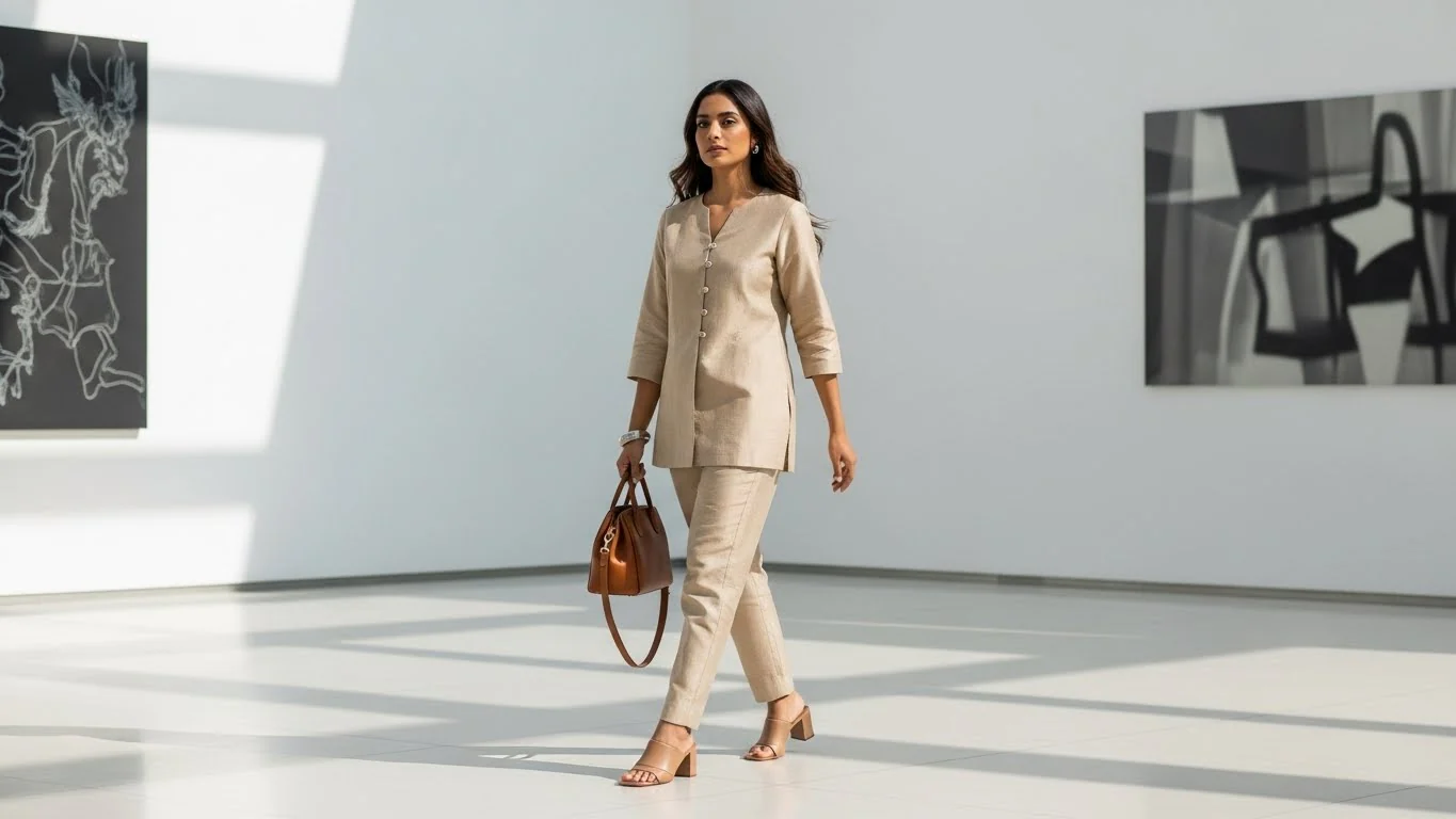 Luxury refines this simplicity through texture and structure. A cream cashmere sweater, a structured wool blazer, or silk trousers in muted tones carry depth without overwhelming the eye.